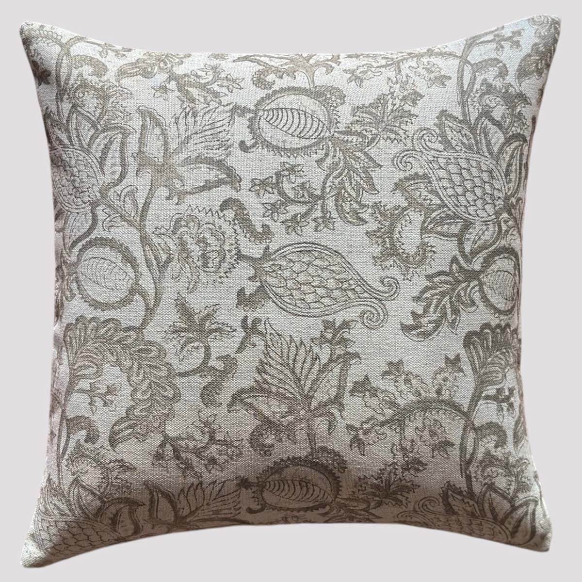The neutral coloured India cushion with its subtle yet beautiful design will work well in many cushion arrangements. It is important to mix scale, pattern and technique to create a good cushion arrangement.