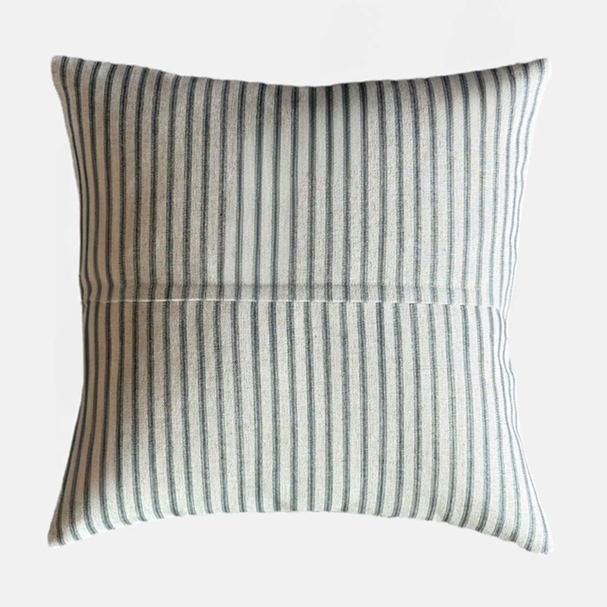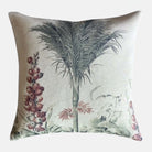 Inspired by nature the printed design on this cushion evokes a tropical landscape complete with palm tree and other exotic plants. The reverse features a sage green ticking stripe.