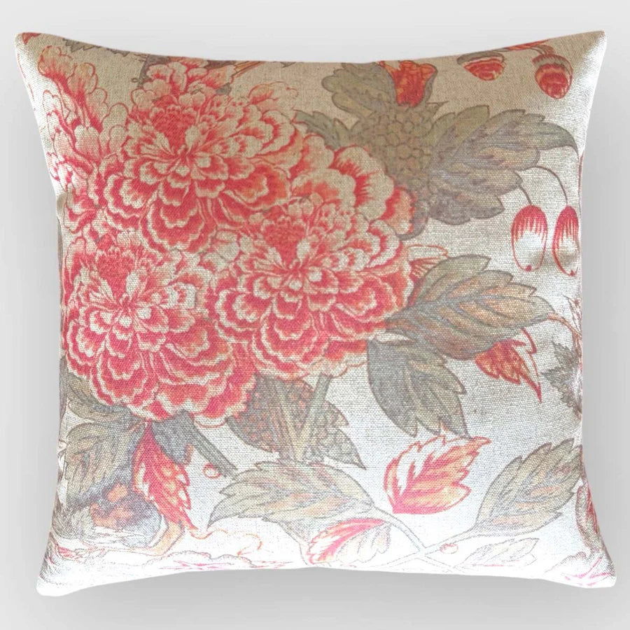 A rich tapestry of coral blooms and muted foliage, the Tullia Cushion brings vintage charm with an eclectic twist. Its painterly florals on a natural linen base make it a sunny statement piece—ideal for layered, character-filled interiors.