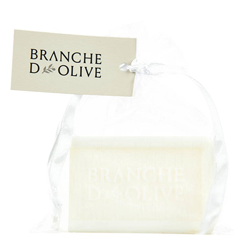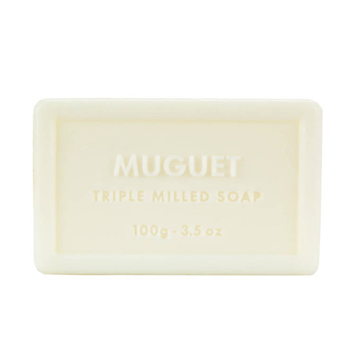 A beautiful hand stamped, triple milled luxury soap in Branche d'Olive's timeless Muguet (Lily of the Valley) fragrance with dewy greens, musk and ylang ylang.