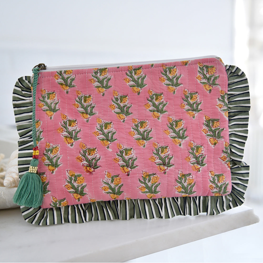 Pink Block Print Quilted Make Up Bag With Ruffle Trim