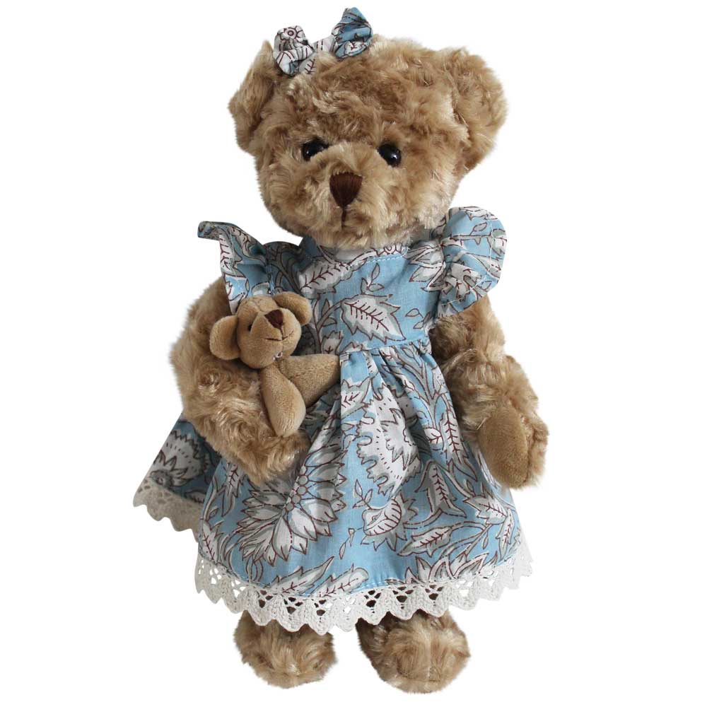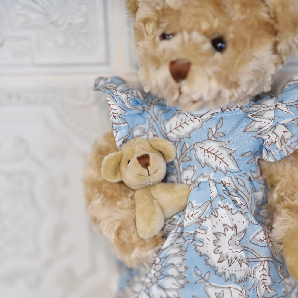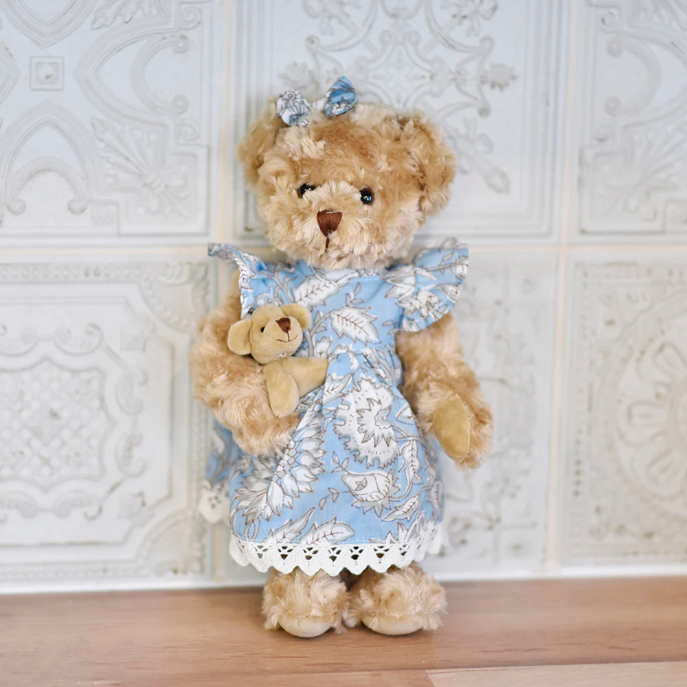 This beautiful teddy bear wears a pretty cornflower blue print cotton removable dress. The white flowers and leaves are outlined in light grey and look beautiful against the soft blue background. The dress is trimmed with crochet lace on the hem. She has a matching bow on her ear and carries her own little velvety teddy bear.