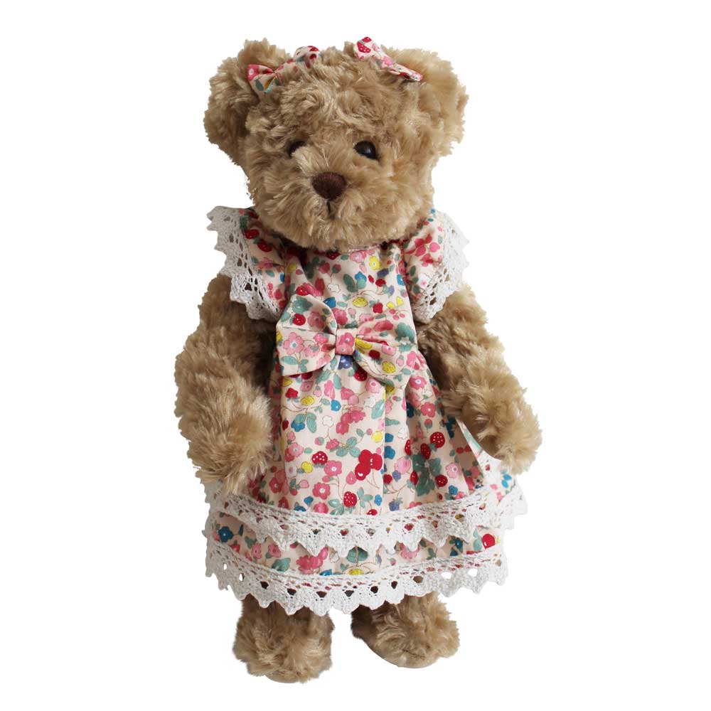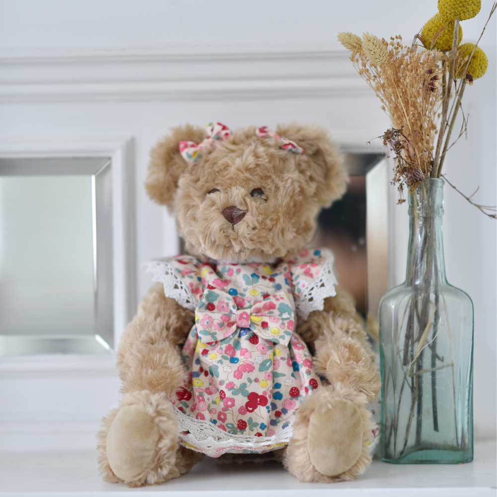 This sweet little teddy bear wears a removable dress in a colourful print with flowers and fruit and matching bows on her ears. The short-sleeved dress has two rows of lace on the hem, lace trim on the sleeves, and a floral bow on the waistband.